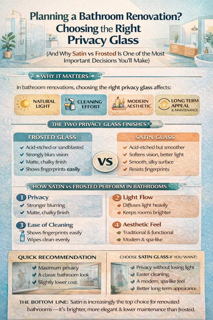 For most modern bathroom renovations—especially those aiming for light-filled, premium interiors—satin glass has become the preferred option, particularly for shower screens and en-suite partitions.